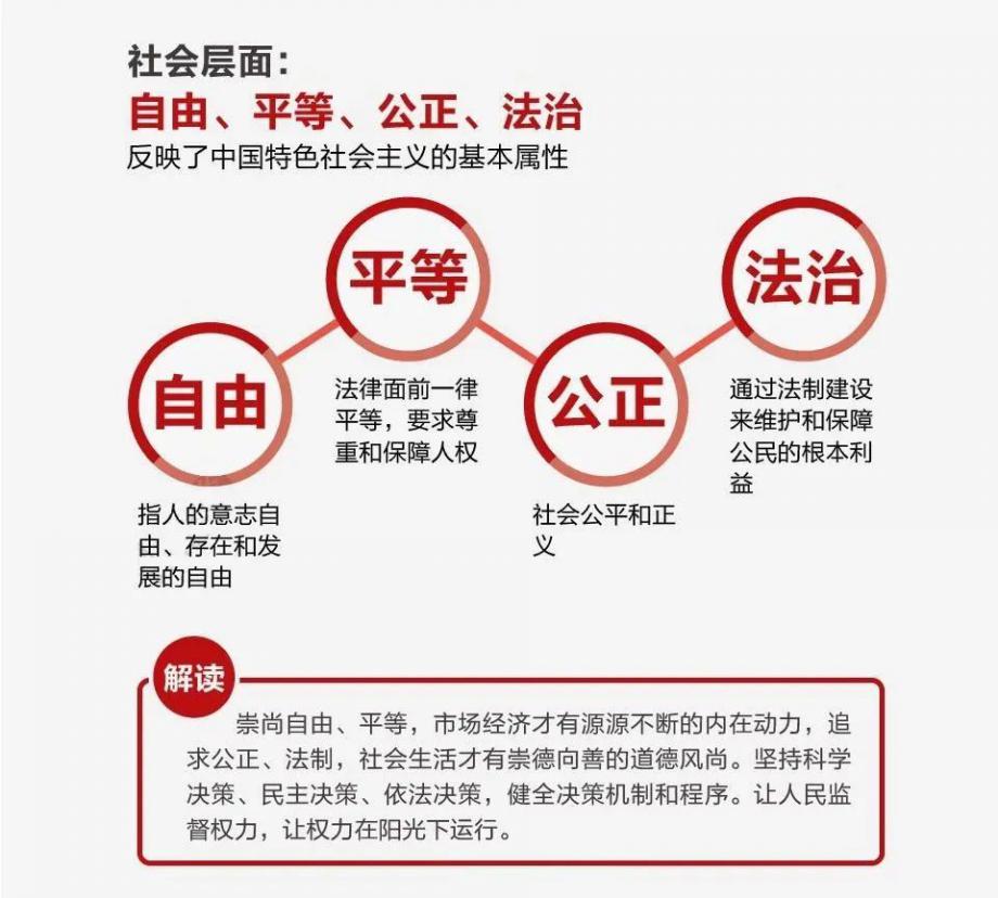 自由、平等、公正、法治體現(xiàn)了社會(huì)主義核心價(jià)值觀在價(jià)值導(dǎo)向上的規(guī)定,是立足社會(huì)層面提出的要求,反映了社會(huì)主義社會(huì)的基本屬性,始終是我們黨和國(guó)家奉行的核心價(jià)值理念。